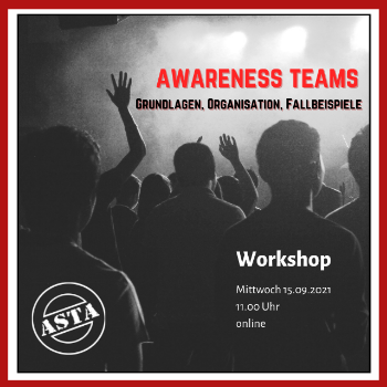 Anmeldung: Bitte meldet euch mit einer Mail an astarepo[at]uos.de an und schreibt uns, ob ihr schon Erfahrung mit Awarenessarbeit gesammelt habt.