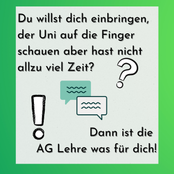 In der AG Lehre arbeiten Lehrende und Studierende zusammen, um die Quantitäts- und Qualitätsziele der Universität zu verankern und zu evaluieren, wie diese in den Fächern umgesetzt werden. Da die aktuellen studentischen Mitglieder die AG verlassen werden neue Studierende gesucht, die Lust haben, ehrenamtlich aktiv in der AG Arbeit mitzuwirken.