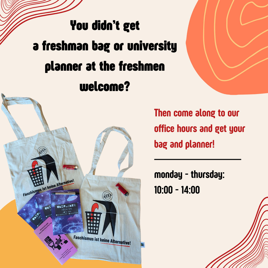 You were very late at the freshman welcome, didn't see us there or didn't make it at all, but would still like our freshman bag and university planner?